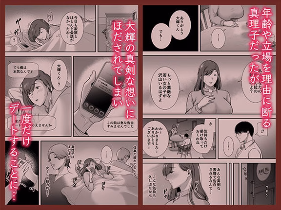 パートで働く人妻・真理子(32歳)が、息子と同い年の同僚・大輝(20歳)に告白されるという設定から物語は幕を開けます。家族に冷たくされた真理子は、大輝のまっすぐな熱意に押されてデートを重ねるうちに、肉体関係を持ってしまうという展開。若い大輝の体力と真理子の女性としての悦びが交錯する様は、読者に強い興奮を与えます。